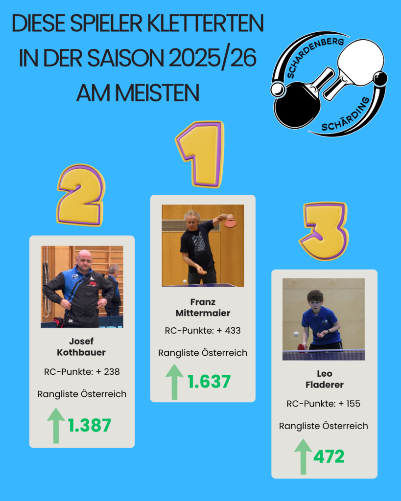 1. Mannschaft: Landesklasse Bester Spieler: Gabriel Fesel -> Nr. 5 der Liga (28:8) Die 1. Mannschaft belegte einen starken 3. Platz in der Landesklasse und behauptete sich damit bereits zum 9. Mal in Folge als Nummer 1 im Bezirk Schärding. Trotz einer gezielten Personalrotation zur Unterstützung der 2. Mannschaft präsentierte sich das Team stets im oberen Mittelfeld. Für den Aufstieg reichte es zwar nicht, da Freistadt und Ottensheim über die gesamte Saison hinweg zu konstant agierten, jedoch gelang unserer Mannschaft ein besonderes Highlight: Die einzige Saisonniederlage des Meisters aus Freistadt wurde ihnen von uns zugefügt.